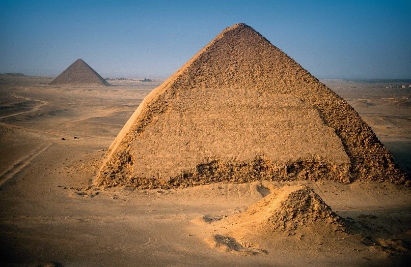 El proceso de transformación consistió en añadir bloques de piedra a la estructura original hasta darle la forma perfecta, pero los nuevos sillares no se sujetaron bien al cuerpo de la pirámide escalonada y acabaron deslizándose y cayendo al suelo. Lo que vemos en la actualidad es el resultado de un desastre de ingeniería y de siglos de vandalismo, pues las piedras caídas fueron sustraídas y utilizadas por generaciones de lugareños como material de construcción para sus casas. No obstante, esta pirámide presenta una novedad fundamental y revolucionaria: en su interior hay una gran sala, que debería de haber albergado el sarcófago y el ajuar funerario de Esnofru, cubierta por una gran bóveda en saledizo que desvía todo el peso que gravita sobre ella hacia los lados y evita así que se derrumbe la sala y con ella el edificio. Una bóveda en saledizo es exactamente una pirámide escalonada dentro de la pirámide. Es algo así como cuatro escaleras, la una enfrente de la otra, que confluyen en un mismo y último escalón.